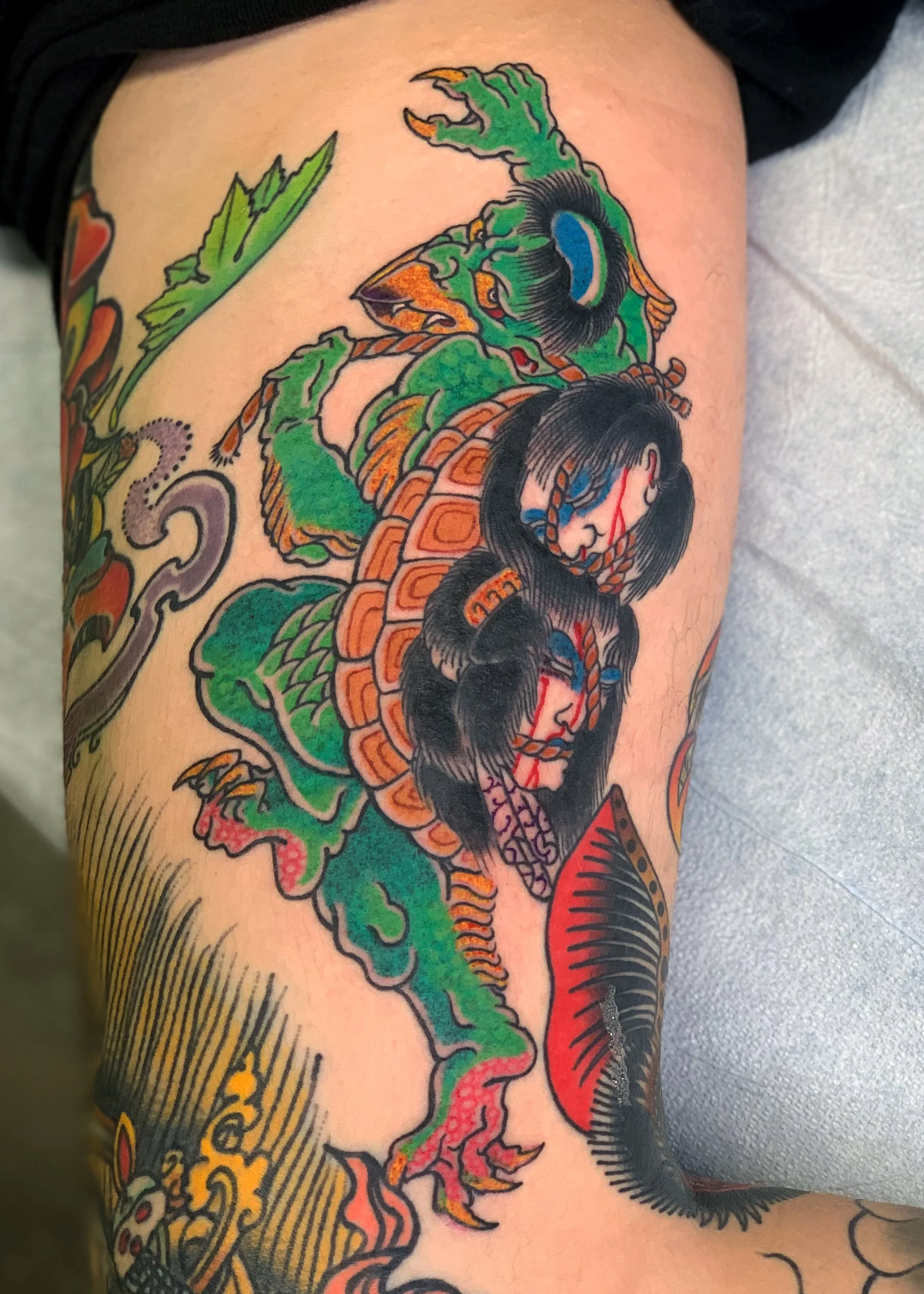 Each tattoo begins with the outline done by machine to ensure clarity and sharpness. Afterward, together with the client, it is decided whether the background, colors, or both will be applied by hand using the traditional tebori technique.